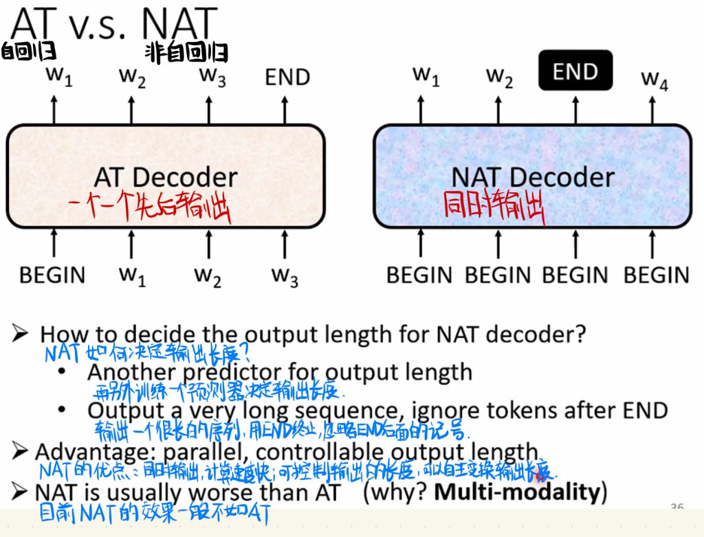 然后我们再来比较自回归(Autoregressive,以下简称AT)和非自回归(Non-autoregressive,以下简称NAT)的区别。