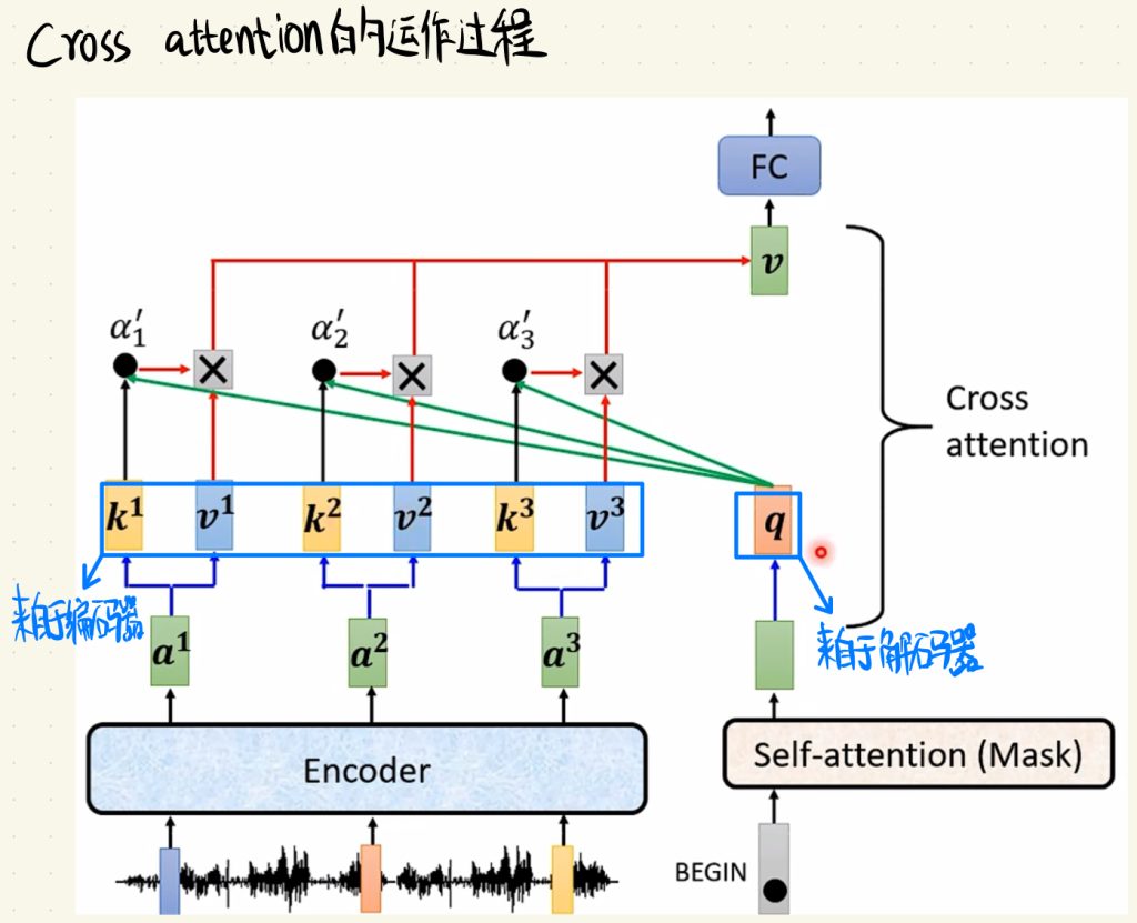 Cross attention里做的就是,先把来自解码器的q和来自编码器的k相乘得到注意力分数α,然后用α乘上另一个来自编码器的v,最后全部加起来就得到了Cross attention的输出v。