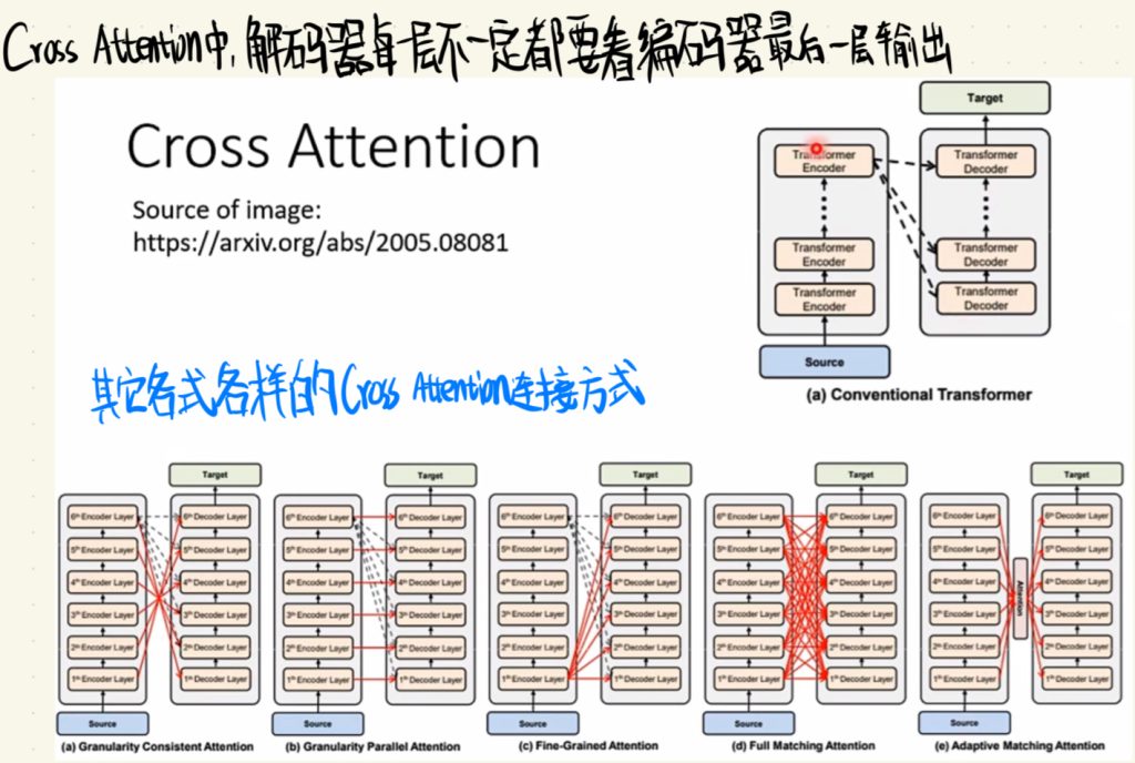 在Cross attention当中,解码器每一层不一定都要看编码器最后一层的输出。