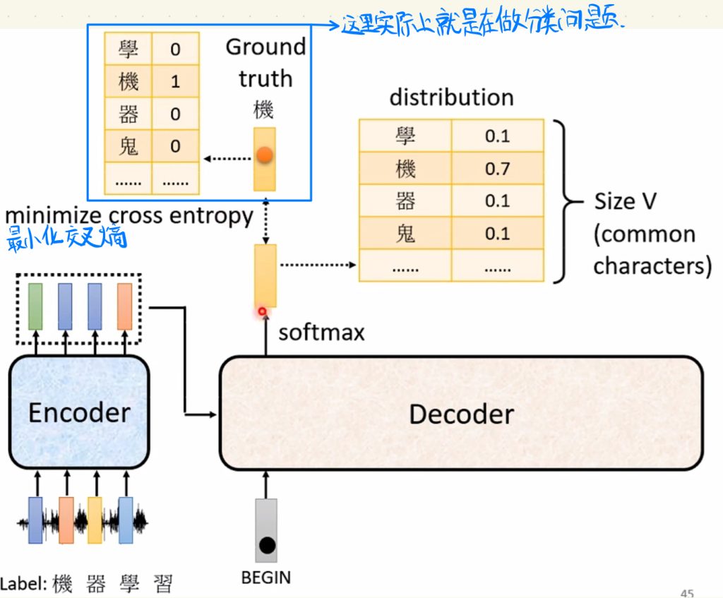 我们把解码器输出经过softmax之后得到的带有每一个元素分数的向量做最小化交叉熵得到最终的输出,这里实际上用到的就是以前课中学过的分类问题。