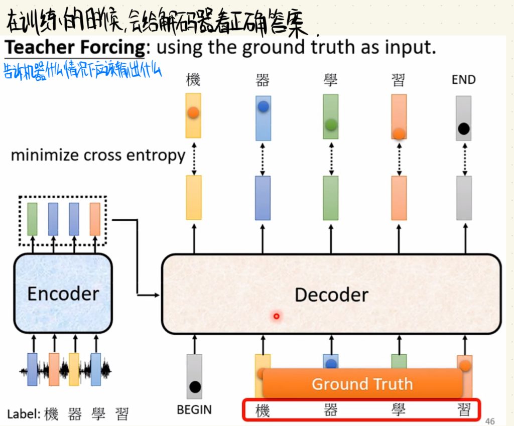 然后在训练的时候,一般会给解码器看正确的答案,告诉机器什么情况下应该输出什么。(这里的这个做法其实有问题,后面会再解释)
