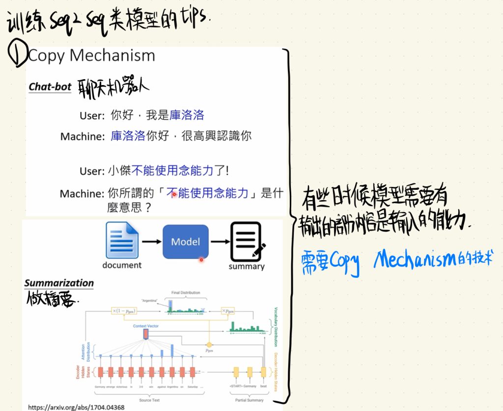 在一些实际问题上,我们需要模型有输出的部分内容是输入的能力。比如在聊天机器人里面,需要对名字或者说它不理解的东西作为输出,再比如做摘要的模型中,我们也需要输出的部分内容是输入的能力。这里就需要Copy Mechanism的技术。