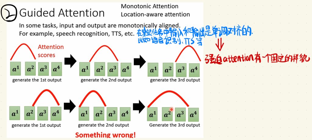 在某些任务中输入和输出是单调对齐的,比如语音识别、TTS等,这个时候我们就不想让attention乱动,我们就可以用Guided Attention技术,强迫attention有一个固定的样貌。