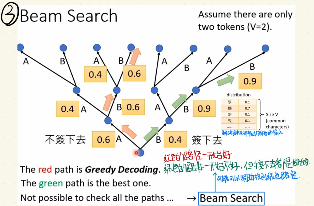 在上面解码器根据向量中得分最高的元素作为输出,然后把这个输出当作下一个输入再得到下一个输出的环节中,可能会遇到上面这样的情况。上面红色路径只是一开始的分数好,绿色的路径一开始不好,但是接下去都是好的。这里Beam Search就可能可以帮助找到这个相对更好的绿色路径,注意这里只是可能。