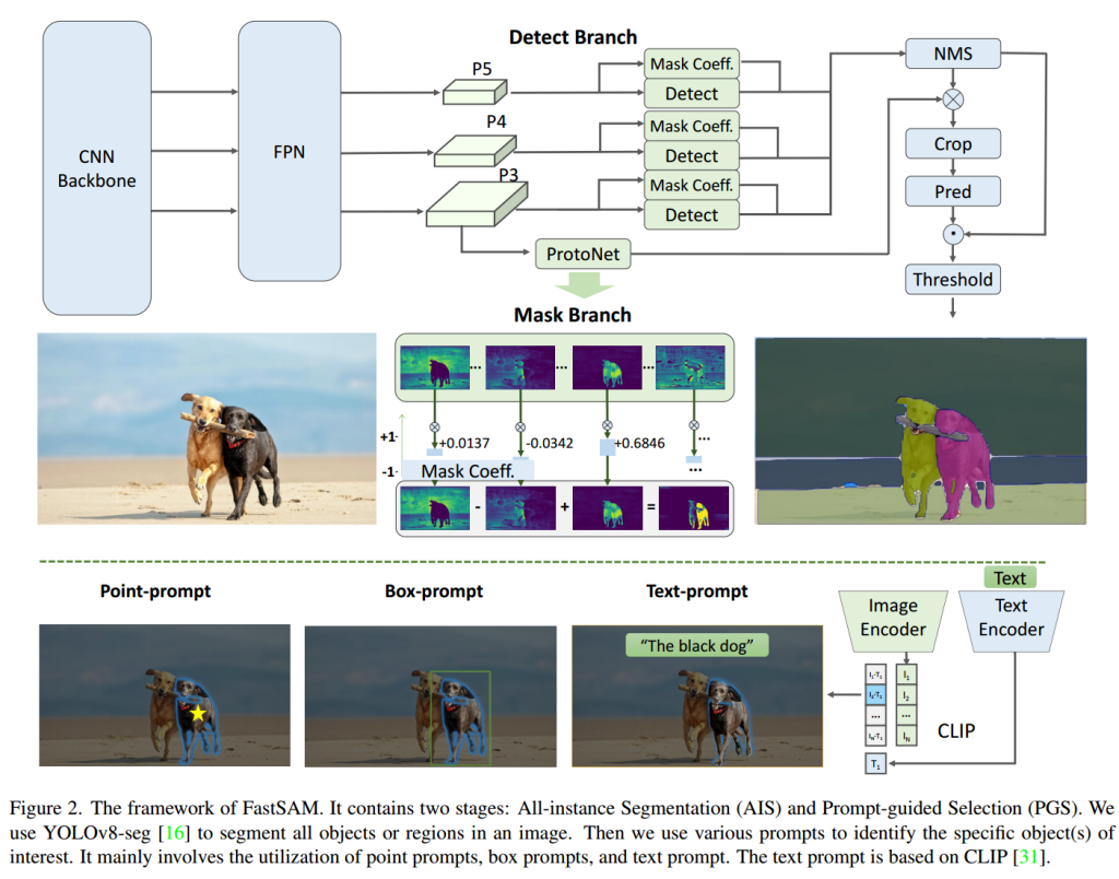 FastSAM模型主要分为两个过程:全实例分割(All-instance Segmentation)和提示引导选择(Prompt-guided Selection)。
