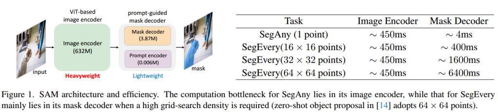 SegAny的计算瓶颈在于其图像编码器,而SegEvery的计算瓶颈主要在于对网格搜索密度要求较高的掩码解码器。