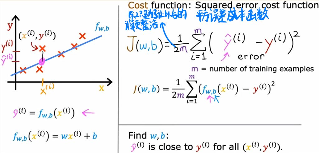 这里是平方误差代价(成本)函数。在式子里面除2只是为了让以后的计算更整洁。