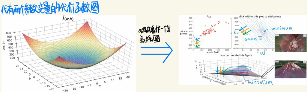 如果将参数变量变为两个,画出来的代价函数图像就是个立体的3维图像,将其看作一个等高线图可以帮助理解。
