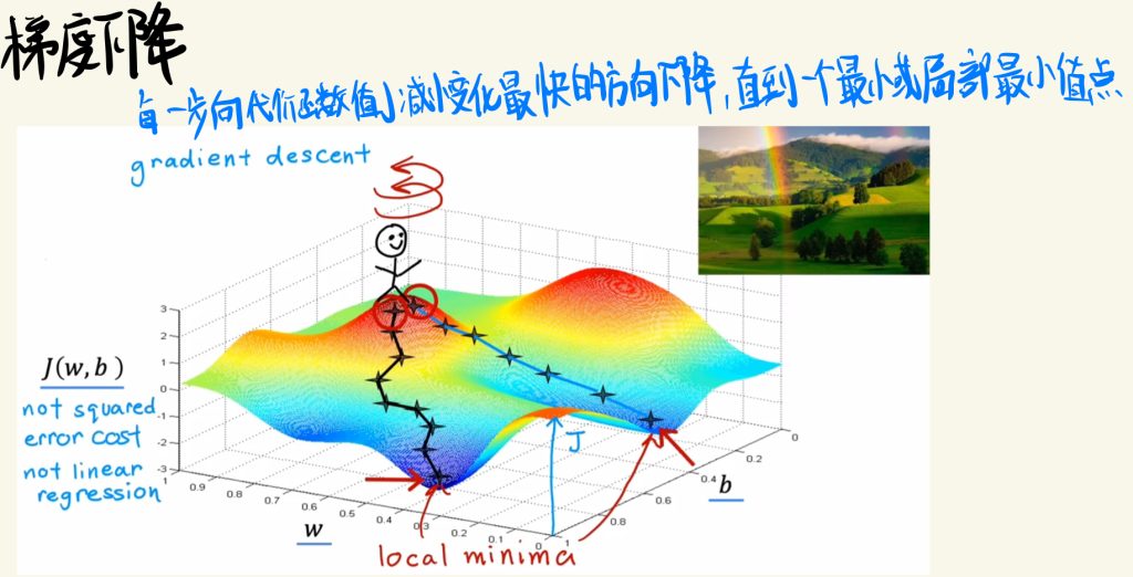 以两个参数变量的代价函数图像为例,为了尽可能减小J,我们使用梯度下降法,这里的做法就是每一步向代价函数值J减小变化最快的方向下降,直到一个最小或局部最小值点。