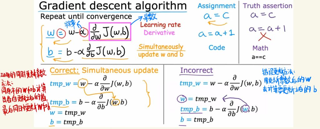 然后如果是两个参数的更新,正确的做法是同原本的w和b计算出各自更新之后的值,最后同时更新w和b。