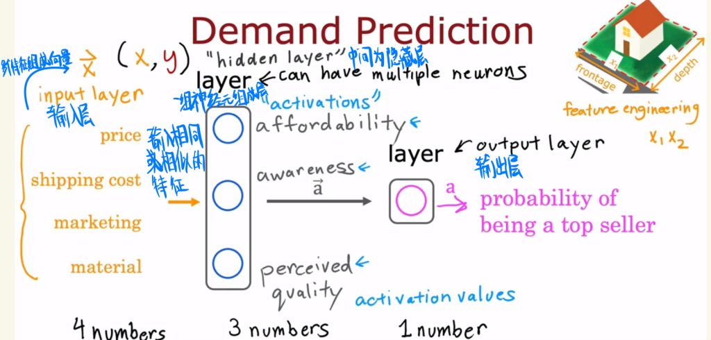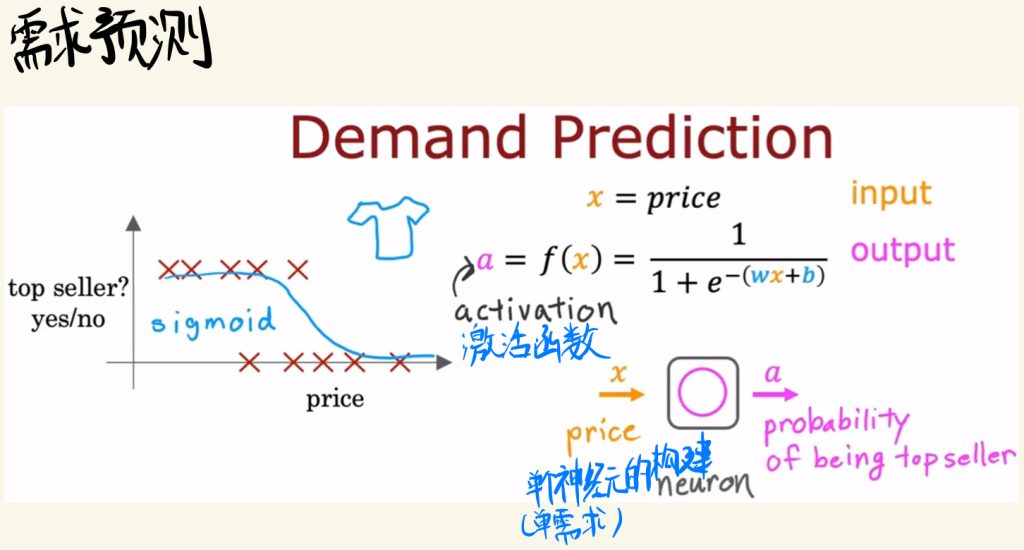 在具体例子当中,比如需求预测问题中,我们还是利用logistic回归作为模型,在神经元中将它称为激活函数。