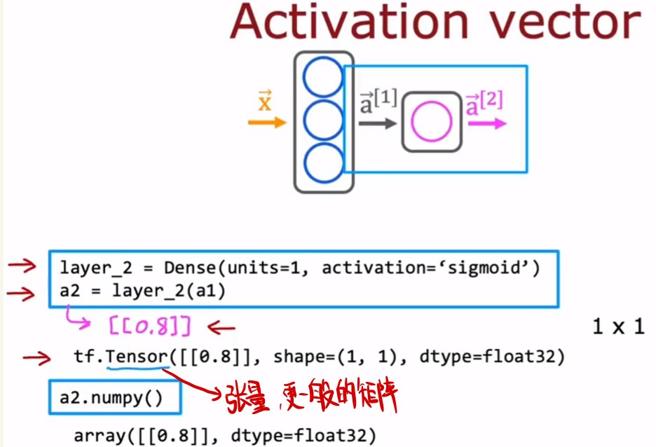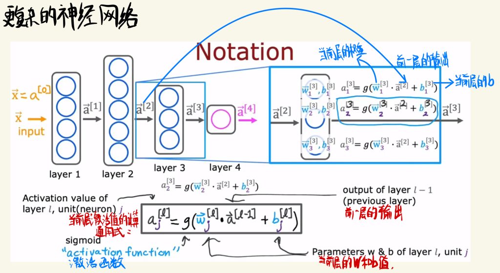 这里说明中间的隐藏层的激活函数a的计算方式,就是用当前层的权值向量w和前一层的输出向量a点乘,然后加上当前层的b值。