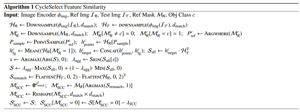 推理的时候,给定一个未标注的测试图像,CycleSelect模块会从已标注的参考图像中找到相似的特征点通过空间循环一致性约束确保匹配点的准确性,并生成提示点。使用生成的提示点来指导SAM进行目标对象的分割