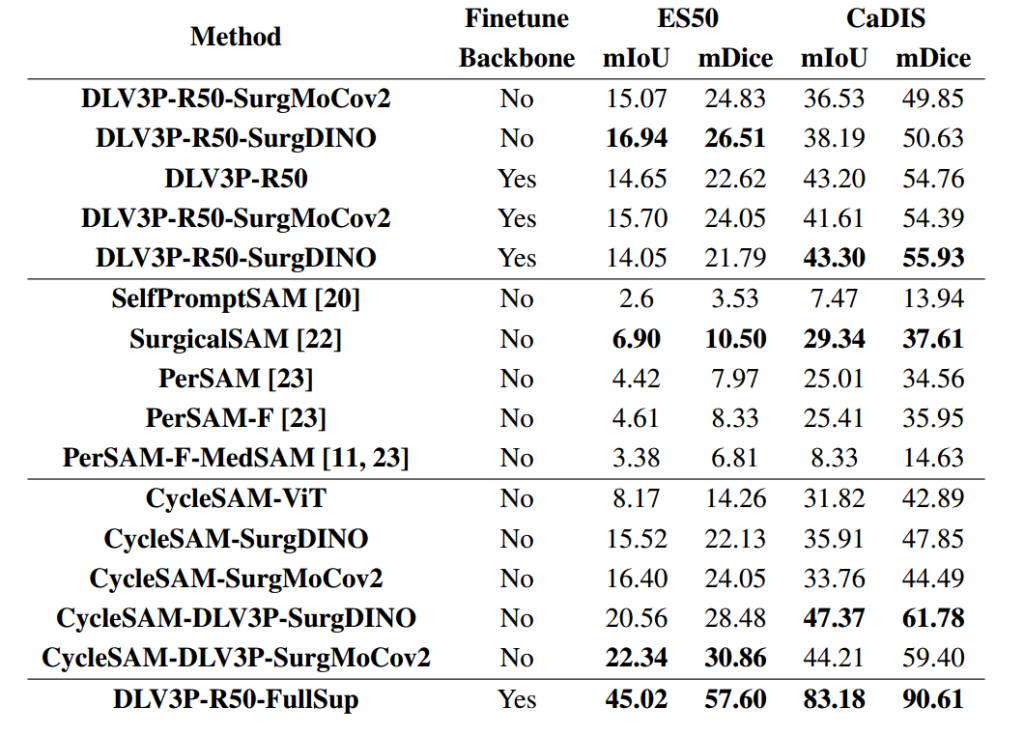 在Endoscapes-Seg50 数据集和CaDIS 数据集中将CycleSAM与其他传统分割方法以及基于SAM的分割方法进行对比,包括全监督方法和一次性分割方法。