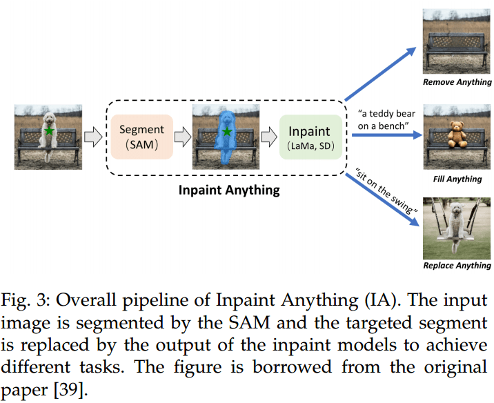 Inpaint Anything (IA) 通过结合SAM、最先进的图像绘制(Stable Diffusion)和AI生成内容(AIGC)模型,通过文本提示用新生成的对象填充选定的对象。