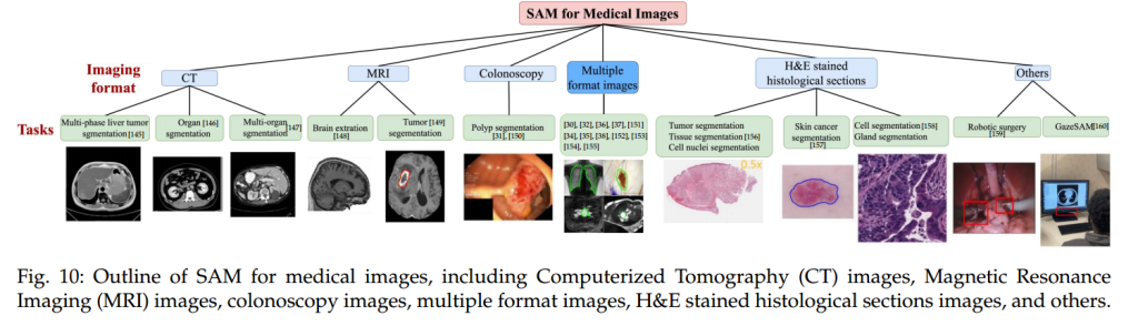 医疗图像分割的目的是展示相应组织的解剖或病理结构,可以用于计算机辅助诊断和智能临床手术。 下图是医疗图像 SAM 概览,包括了SAM在计算机断层扫描(CT)图像、磁共振成像(MRI)图像、结肠镜检查图像、多格式图像、H&E 染色组织切片图像等不同类型图像中的应用。