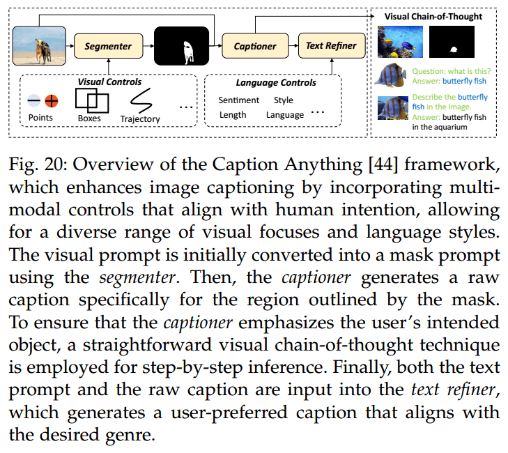 将SAM应用于图像字幕中,Caption Anything(CAT)是一种用于可控图像字幕的方法。CAT 的框架将多模态控制引入图像字幕,呈现符合人类意图的各种视觉焦点和语言风格。