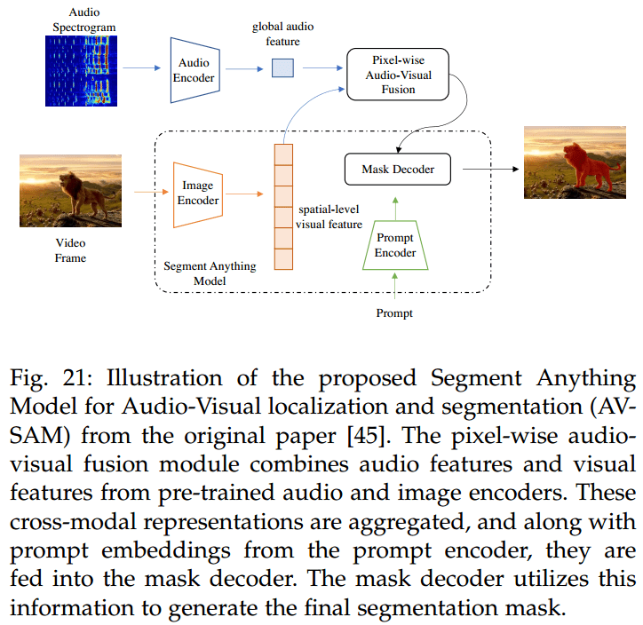 SAM在视听方面也有涉及,AV-SAM的视听定位和分割方法用于学习可以对齐音频和视觉信息的跨模态表示。AV-SAM利用预训练音频编码器和图像编码器中跨音频和视觉特征的像素级视听融合来聚合跨模态表示。然后将聚合的跨模态特征输入prompt编码器和掩码解码器,生成最终的视听分割掩码。