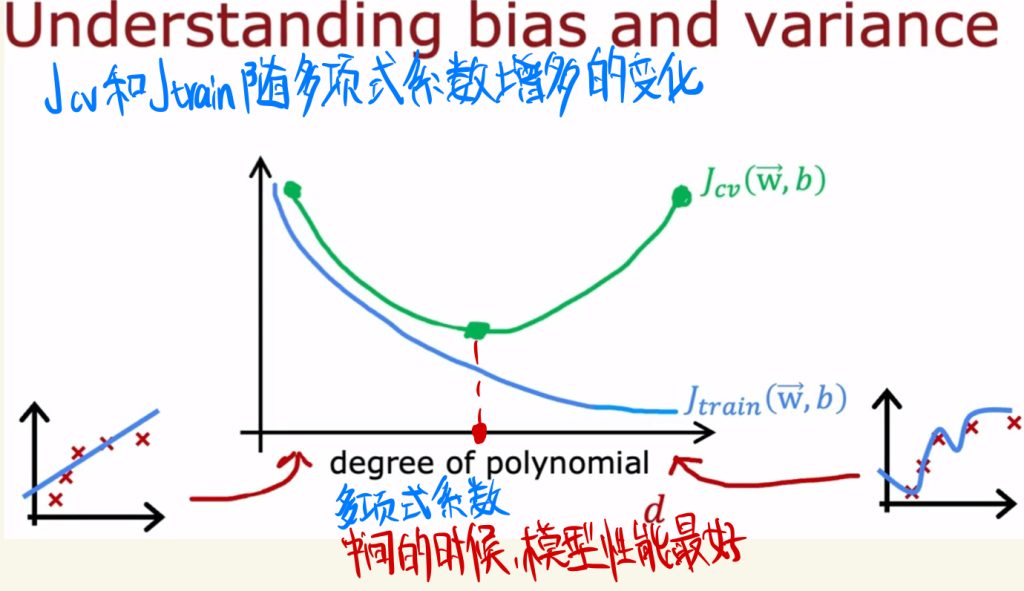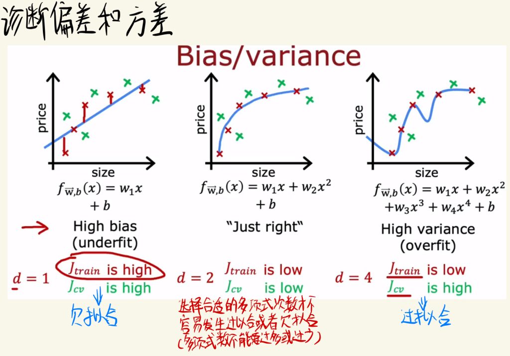 如下图,多项式次数d选择比较小时,之前所说的train中的J很高,cv的J也很高,这就是欠拟合。