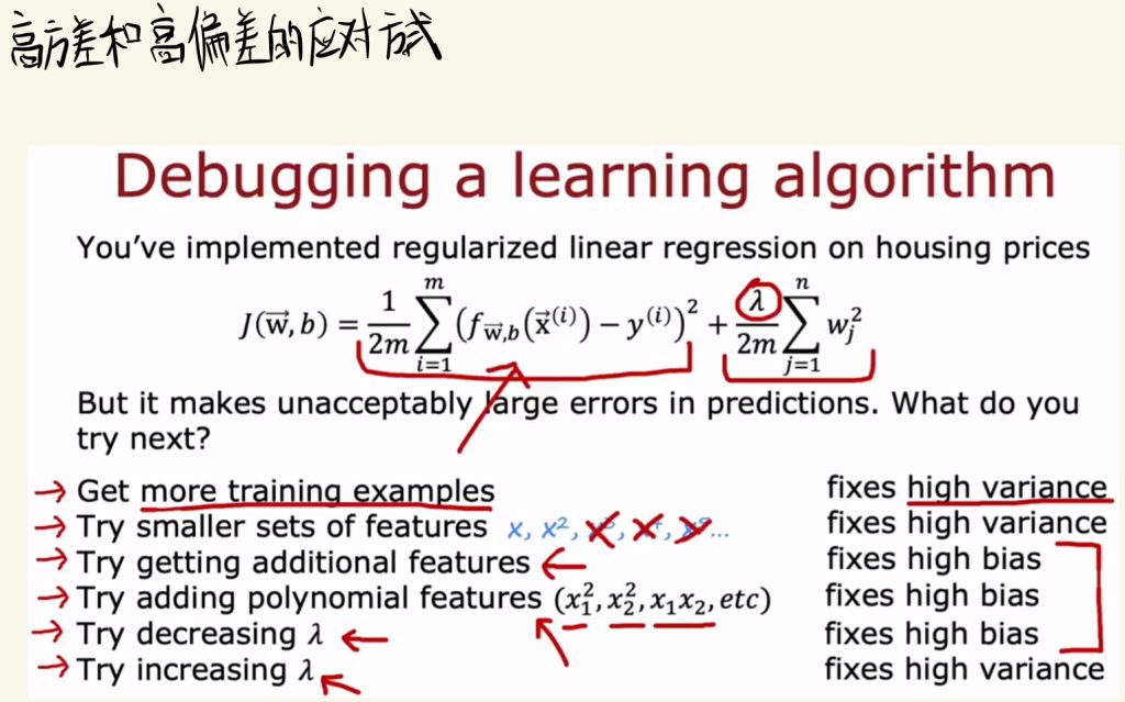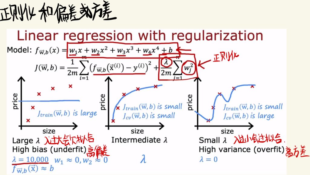 λ过大会欠拟合,称之为高偏差;λ过小会过拟合,称之为高方差。