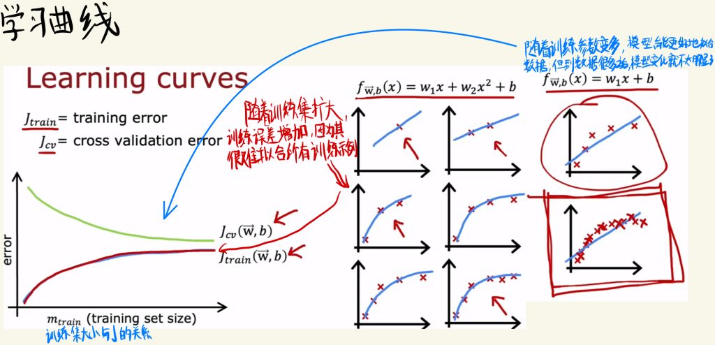 如下面的右图,如果在训练集中的J很低,但是在测试集中的J很高,那就说明模型不太能在没有见过的数据有有很好的泛化能力。这也就是过拟合。