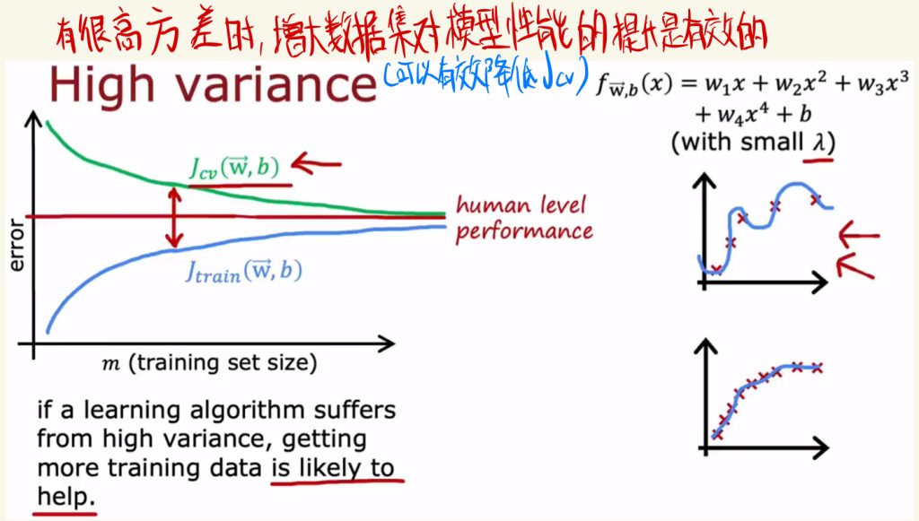 有很高方差时,增大数据集对模型性能的提升还是有不错效果的。(可以有效降低cv的J)