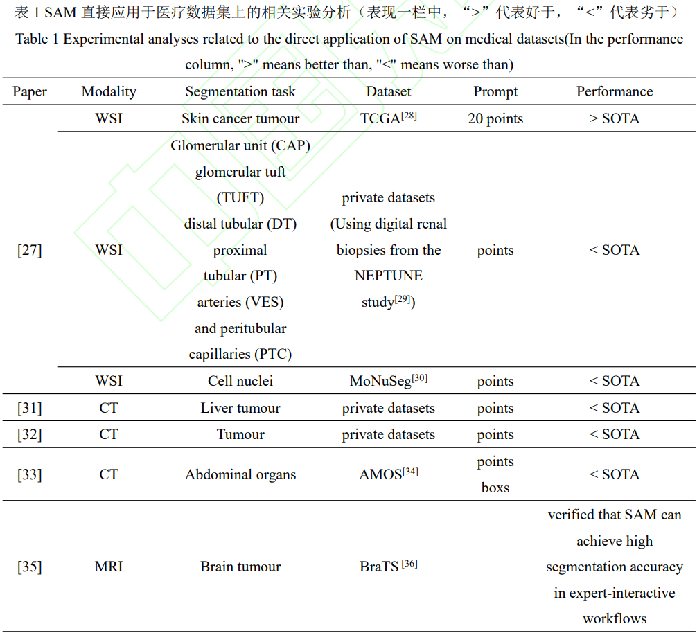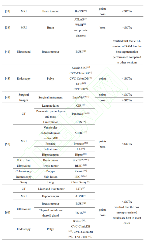 在大多数情况下,未经过微调的SAM直接应用在医学数据集上的表现无法与当前最优方法相比。具体来说: