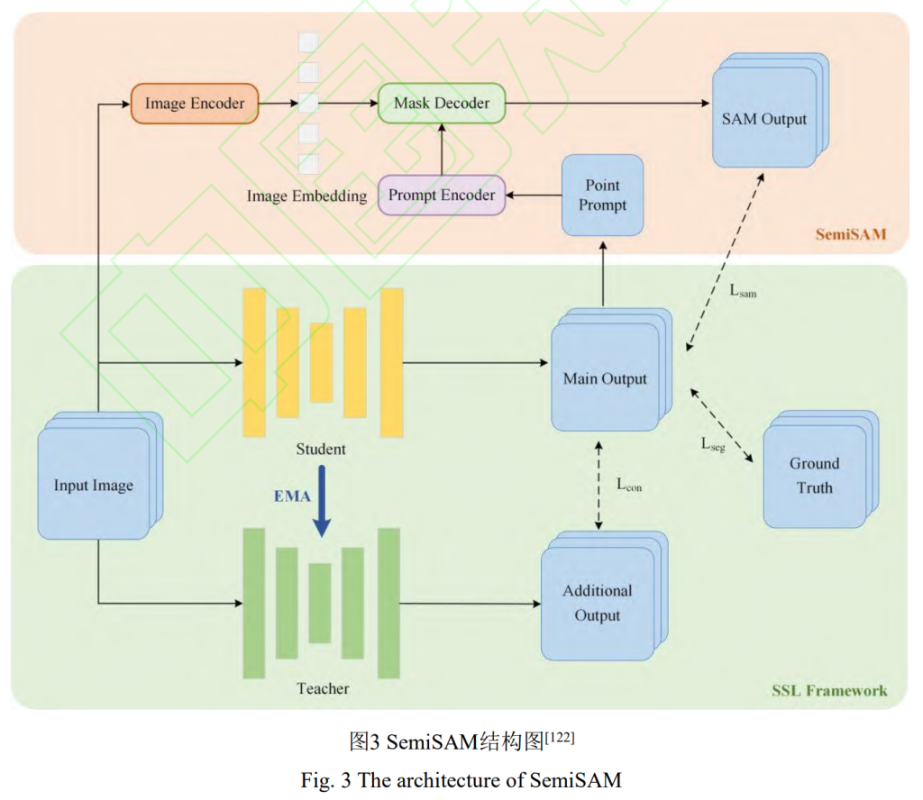 SemiSAM不仅提供了定位信息,也为SAM生成输入提示,之后利用SAM生成的伪标签作为额外的监督,来辅助半监督框架的学习。