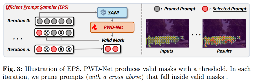 EPS的设计目标是覆盖尽可能多的对象,同时减少冗余提示。主要分为密集网格生成(初始生成覆盖整个图像的密集提示网格)和冗余提示修剪(通过计算提示之间的相似度,去除冗余提示,保留具有代表性的提示)。