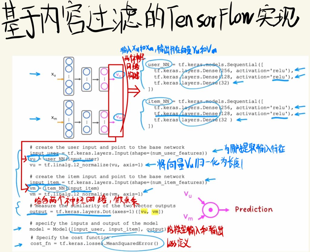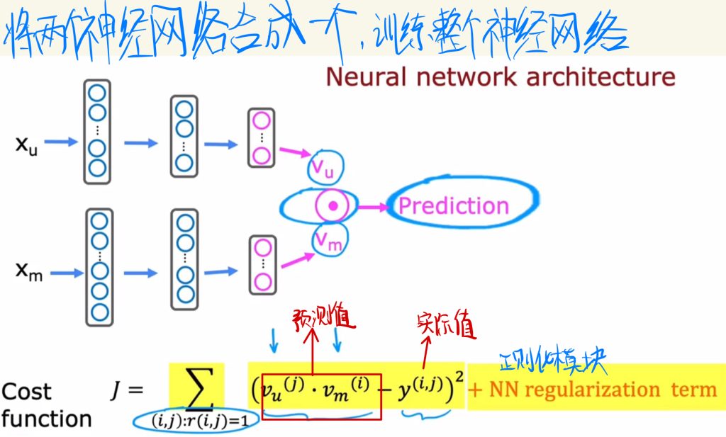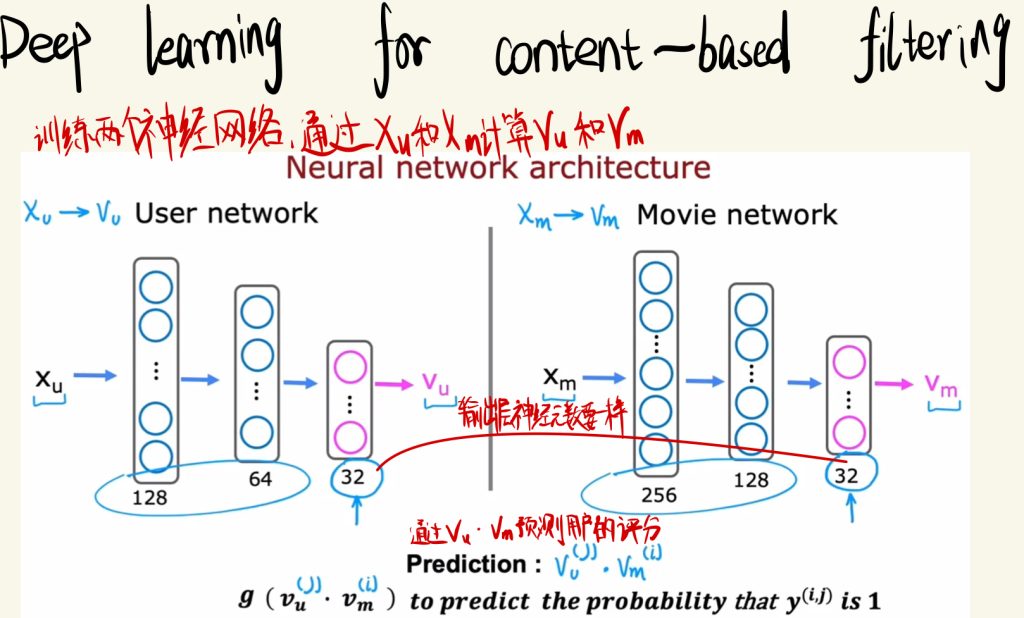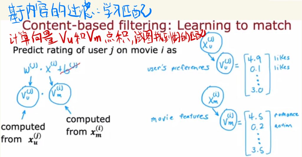 基于内容的过滤方法主要是学习匹配。计算两个向量vu和vm的点积,这个就是预测的值,然后试图根据这个值去找到好的匹配。