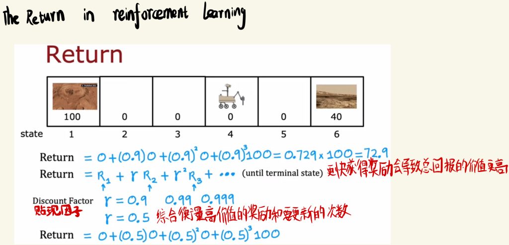强化学习中再引入一个贴现因子的概念,用来综合衡量高价值的奖励和要更新的次数,更快获得奖励会导致总回报的价值更高。