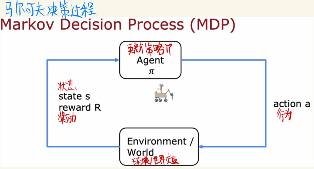 分为更新策略π,然后做出行为,接着与环境/世界进行实际的交互,最后更新状态,看是否给予奖励。