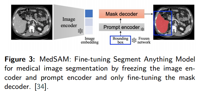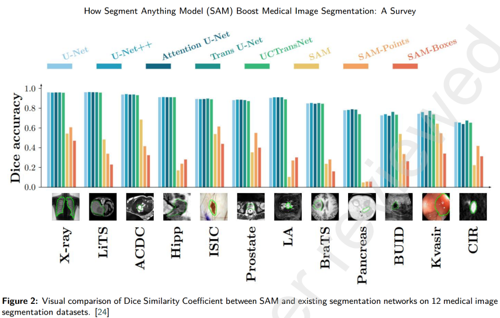 Ma等人通过管理包含超过20万个掩码和11种模式的多样化和全面的医学图像数据集,将MedSAM引入到通用图像分割中,并开发了微调方法,使SAM适应医学图像分割。提出的MedSAM进一步提高了SAM的性能,在21个三维分割任务上的平均骰子相似系数(DSC)为22.51%,在9个二维分割任务上的平均骰子相似系数(DSC)为17.61%。