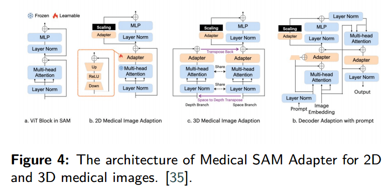 Wu等人将医学SAM适配器(Medical SAM Adapter, MSA)引入到使用Adaption模块的参数高效微调范式中,对预训练的SAM进行微调,因为它可以通过更快的更新实现高效学习,并避免灾难性遗忘。