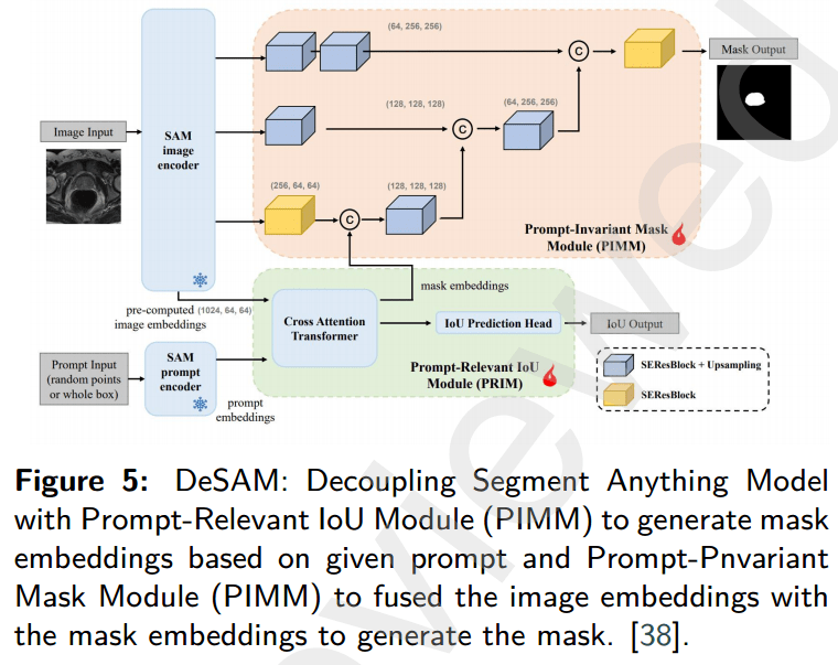 增强对错误提示的鲁棒性:尽管在医学数据集上微调SAM可以提高性能,但它仍然需要使用手动给定的框或点,这使得完全自动化的医学图像分割难以实现。Gao等人提出了一种解耦的Segment Anything Model (DeSAM),通过将SAM的掩模解码器解耦为两个子任务来最小化错误提示引起的性能下降,基于给定提示生成掩模嵌入的提示相关IoU模块(PRIM),以及将图像编码器中的图像嵌入与PRIM中的掩模嵌入融合以生成掩模的提示不变掩模模块(PIMM)。