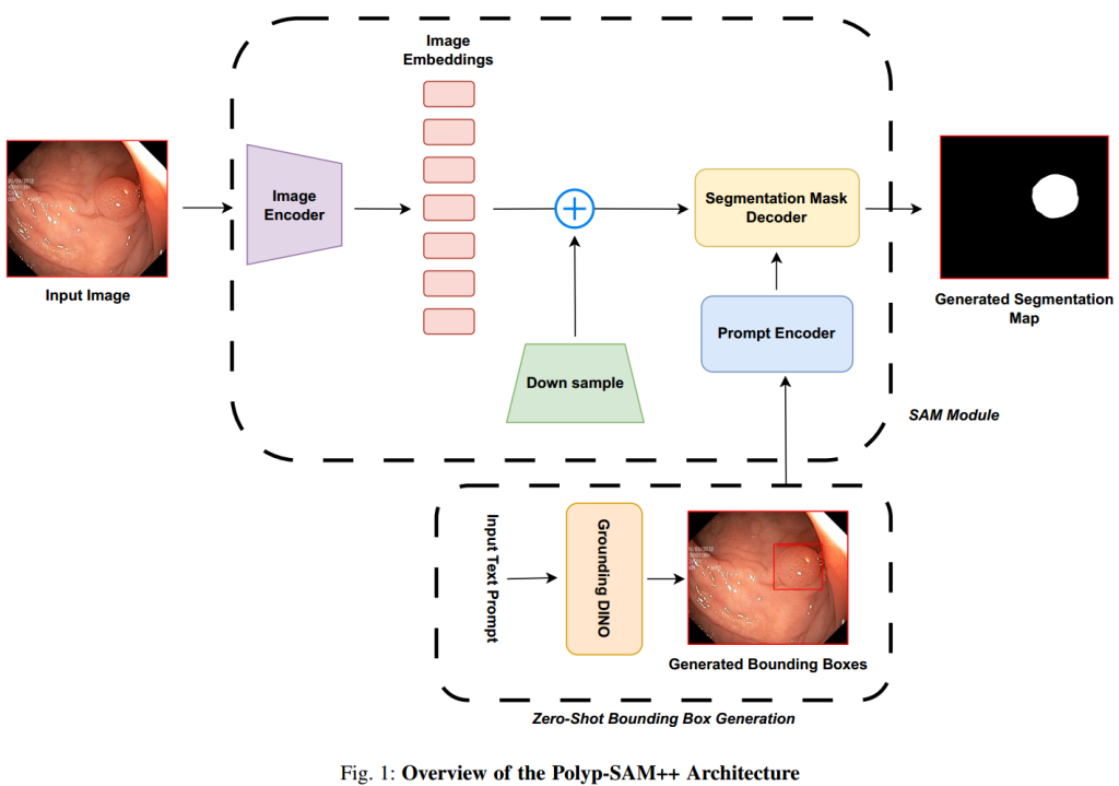 通过手工制作的文本提示引导SAM模型,专注于在结肠镜图像中生成息肉的分割图。