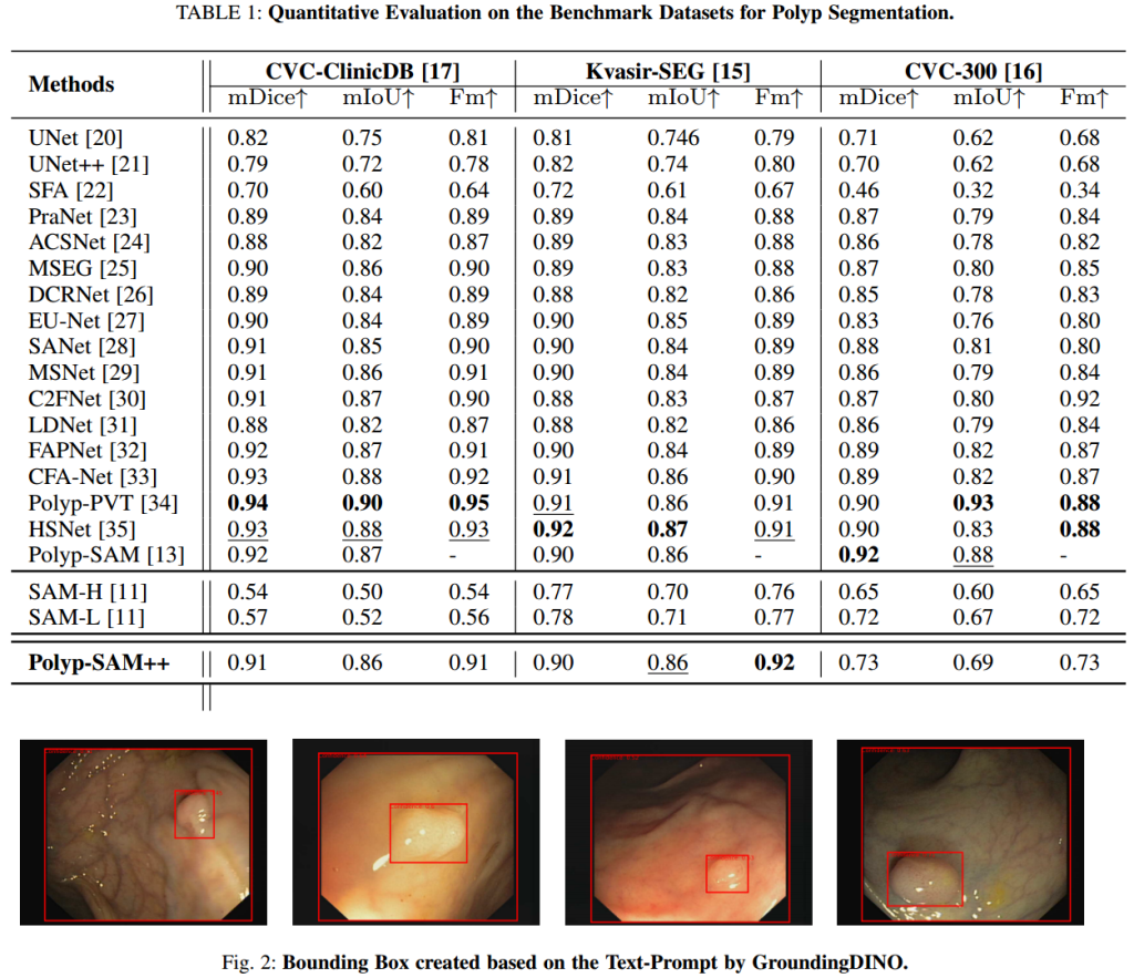 根据分析,可以发现使用像SAM这样的模型的缺点在于定位目标,因为一旦实现了定位,SAM就能够有效地对其进行分割。文本引导不仅有助于输入图像中息肉的定位,而且有助于生成更好的分割图。